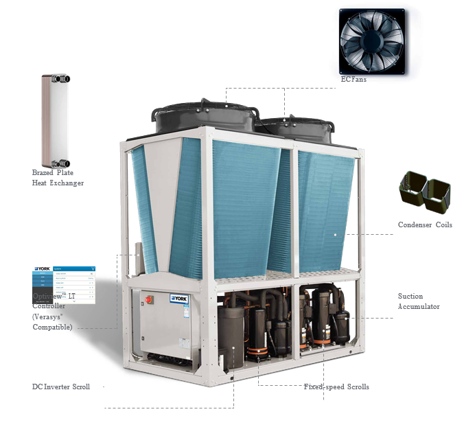 +) The YORK® Amichi™ Series is a no-compromise solution for a variety of climates and locations. Built specifically to deliver better performance through a wider operating envelope, the Amichi™ chiller and heat pump can maintain efficiency in a variety of conditions without kits or add-ons – down to an impressive -18°C ambient in cooling mode and -15°C ambient in heating mode.