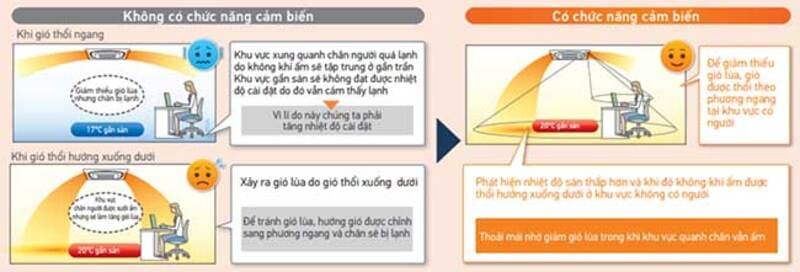 – Xác định nhiệt độ sàn, ngăn chặn hiện tượng quá lạnh / nóng. Nhiệt độ khu vực cạnh cơ thể người được tự động tính toán bằng cách phát hiện nhiệt độ sàn. Năng lượng được tiết kiệm do khu vực quanh chân không bị quá lạnh.