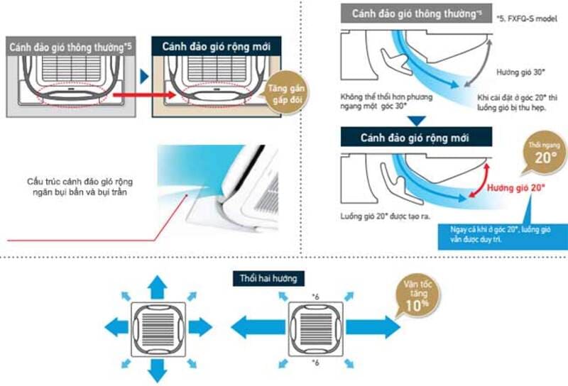 + Thứ nhất: Sử dụng cánh đảo gió rộng mới (thẳng): Với cánh đảo gió loại mới hơn, quỹ đạo gió thẳng hơn, độ bao phủ gần gấp đôi. Cấu trúc cánh đảo gió rộng ngăn bụi bẩn và bụi trần. Bằng cách thu hẹp 2 đầu cánh đảo gió, luồng gió gây ra bụi trần được hướng xuống dưới.