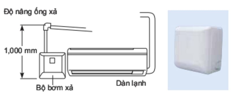 Bơm nước xả là phụ kiện tùy chọn, độ nâng ống xả là 1000m tính từ đáy máy. 5 góc thổi có thể được cài đặt bằng bộ điều khiển từ xa.