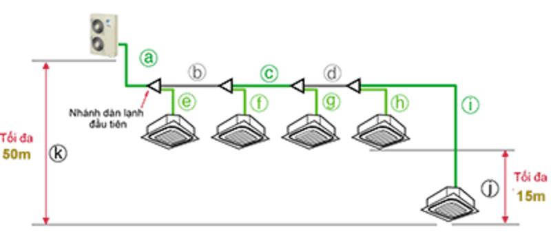 Chiều dài ống cho phép tối thiểu: Dàn nóng – bộ chia nhánh dàn lạnh đầu tiên là 5m.