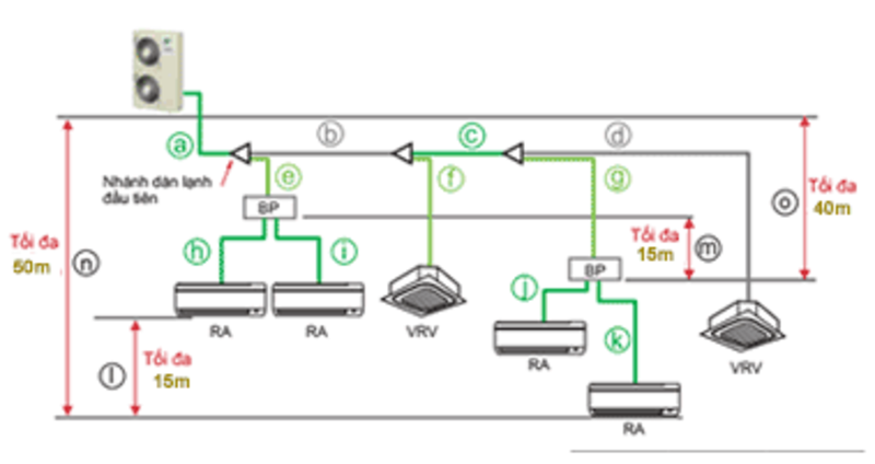 Chênh lệch độ cao cho phép tối đa: Giữa các dàn lạnh là 10m; Giữa các bộ BP là 15m; Giữa dàn nóng – dàn lạnh nếu dàn nóng cao hơn là 50m, nếu dàn nóng thấp hơn là 40m; Giữa dàn nóng – Bộ BP là 40m.