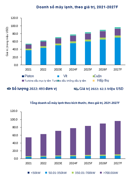 Máy làm lạnh vít là loại được ưa chuộng nhất, chiếm khoảng 50% thị trường máy làm lạnh tổng cộng tại Việt Nam theo khối lượng. Do sự tăng trưởng trong ngành công nghiệp, đoạn này đã chứng kiến sự tăng trưởng vào năm 2022. Máy làm lạnh loại Screw dự kiến sẽ tăng nhanh hơn về khối lượng so với các đoạn khác.