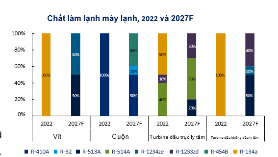 Chất làm lạnh R134a là loại chất phổ biến nhất được sử dụng tại Việt Nam vào năm 2022 trong máy lạnh vít. Tuy nhiên, đến năm 2027, R513a và R1234ze dự kiến sẽ trở thành các chất làm lạnh chính cho máy làm lạnh vít. Năm 2022, thị trường máy làm lạnh scroll được thống trị bởi việc sử dụng chất làm lạnh R410A. Chất làm lạnh này sẽ tiếp tục thống trị vào năm 2027.