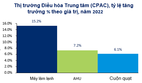 - Động lực thị trường : Đoạn AC chia đơn đã chứng kiến sự suy giảm nhỏ vào năm 2022; tuy nhiên, nó vẫn tiếp tục chiếm ưu thế trên thị trường máy điều hòa không khí Việt Nam, chiếm hơn 95% thị trường theo khối lượng và 79 % theo giá trị vào năm 2022. Đất nước chứng kiến một mùa đông kéo dài vào năm 2022 và điều này có thể thúc đẩy thịtrường máy điều hòa không khí với bơm nhiệt trong tương lai gần. Thị trường máy điều hòa không khí với bơm nhiệt hiện đang thấp. R32 là chất làm lạnh phổ biến nhất và với các chính sách của chính phủ tập trung vào việc sử dụng chất làm lạnh thân thiện với môi trường, ngay cả các thương hiệu nhỏ cũng sẽ dần chuyển sang sử dụng chất làm lạnh R32 trong tương lai. Máy làm lạnh loại vít vẫn tiếp tục là lựa chọn hàng đầu tại Việt Nam. Theo khối lượng, chúng chiếm hơn một nửa thị trường máy làm lạnh vào năm 2022. Máy làm lạnh ly tâm không được ưa chuộng do chi phí cao của chúng. Giá sản phẩm trên tất cả các phân khúc thị trường tăng do chi phí nguyên liệu cao hơn.