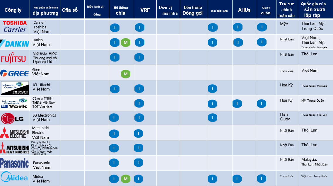 - Nhà sản xuất : Thị trường máy lạnh tách biệt tại Việt Nam đang được thống trị bởi các thương hiệu máy lạnh của Nhật Bản và Hàn Quốc. Daikin, Panasonic và LG là ba nhà sản xuất chính, chiếm hơn một nửa thị trường máy lạnh chia. Trong những năm gần đây, Casper đã trở thành một nhà sản xuất quan trọng trên thị trường máy lạnh không ống. Casper cũng đã mở rộng sang các sản phẩm tiêu dùng khác. Lấy cảm hứng từ Casper, các nhà sản xuất tiêu dùng khu vực khác như Funiki, Nagakawa, Karofi cũng đã gia nhập thị trường máy lạnh. Thị trường máy lạnh chia chủ yếu được hỗ trợ thông qua nhập khẩu Daikin và một số nhà sản xuất khác như Gree, Midea có cơ sở sản xuất địa phương. Trane, Daikin, Carrier và York chiếm ưu thế trên thị trường máy lạnh. Thị trường máy lạnh và thị trường bên hơi được cung cấp thông qua nhập khẩu.