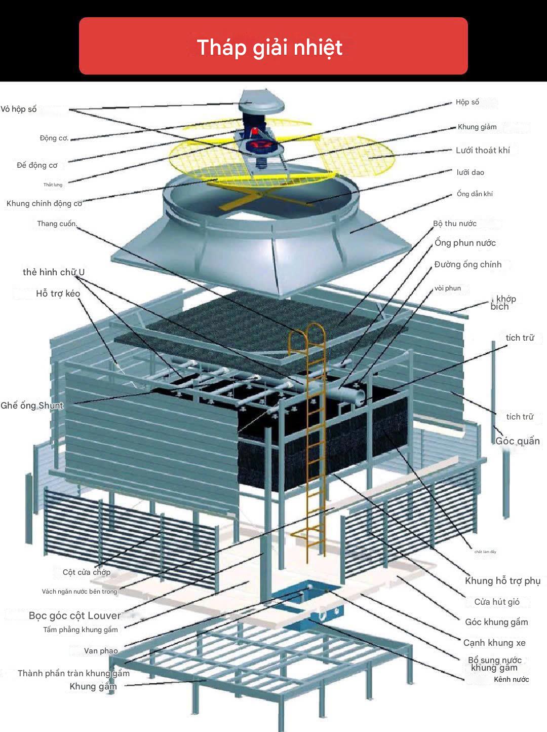 - Quạt (Fan): Tạo ra luồng không khí đi qua tháp, giúp bay hơi một phần nước và làm mát phần còn lại [3].