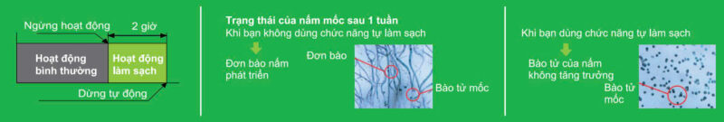 Khi chọn chế độ tự làm sạch, máy sẽ tự vệ sinh khô trong vòng 2 giờ, dàn lạnh được làm khô và hạn chế nấm mốc.