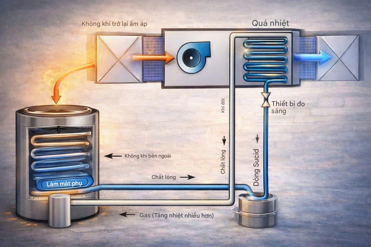Sơ đồ hệ thống nước lạnh làm mát phòng IT/máy tính minh họa một chu trình