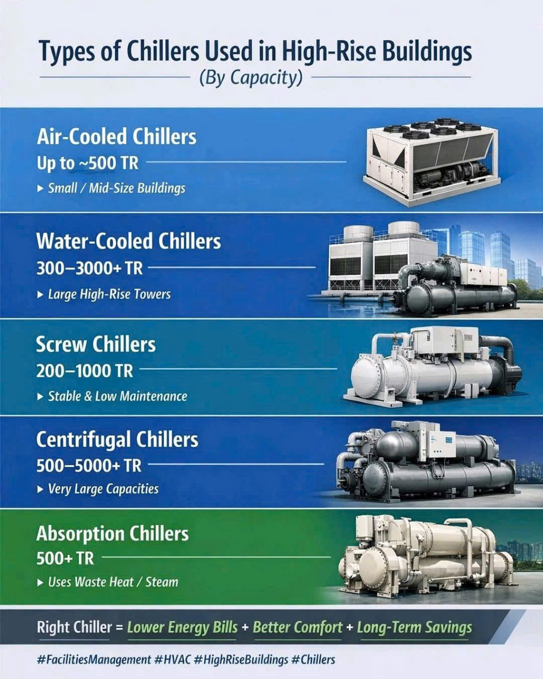 Các loại máy làm lạnh Chiller được sử dụng trong hệ thống tòa nhà theo công suất lạnh