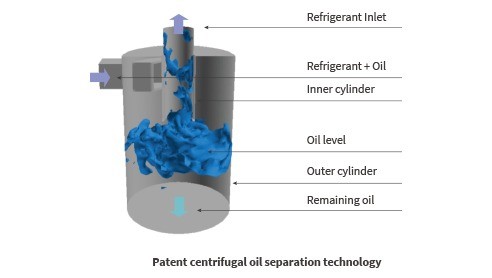 - Hệ thống dầu tiên tiến, được thúc đẩy bởi áp suất chênh lệch,nhằm đảm bảo cung cấp dầu đầy đủ cho máy nén. Không cần thiết kế thêm bơm dầu giúp giảm số lượng linh kiện, cải thiện độ tin cậy và bảo trì.