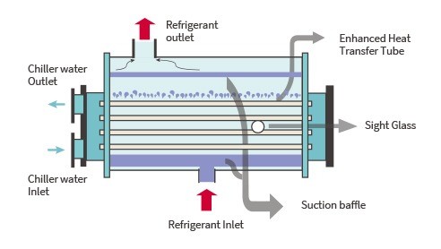 Thiết bị bay hơi sử dụng thiết kế nhiều ống ngập nước với ống truyền nhiệt mới để tạo ra sự hỗn loạn của chất làm lạnh cao hơn giúp nâng cao hiệu quả của hệ thống.