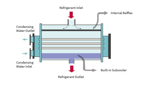 Thiết bị ngưng tụ làm mát bằng nước là thiết bị trao đổi nhiệt dạng vỏ và ống có thể làm sạch được với các ống đồng có vây bên ngoài liền mạch được cuộn thành các tấm ống.